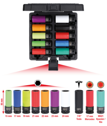 "longDescription": "Robuuste uitvoering, speciaal voor de montage of demontage van wielen, zeskantige, vierkante inbus volgens DIN 3121 / ISO 1174, lange uitvoering, voor machinaal gebruik, met kunststof bekleed voor schadevrij werken aan aluminium velgen, met kunststof inzetstuk ter bescherming van de oppervlakken van de wielbouten, kunststof huls verwisselbaar, kleurgecodeerd naar sleutelmaat, inclusief speciale maat voor Tesla, inclusief speciaal profiel voor Mercedes, Hyundai en Kia, gefosfateerd, chroom-molybdeen, in stevige kunststof koffer<br>",