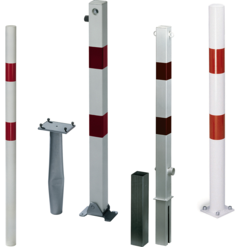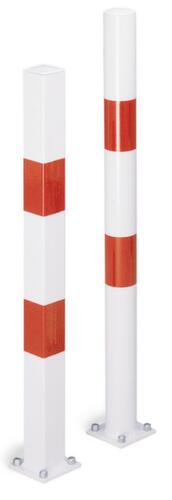 "description": "m. platte kop, HxBxD 1000x70x70mm, staal, rood/wit, in-/uitklap-/afsluitbaar, driekantslot, m. grondplug",