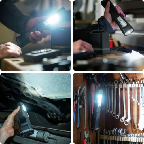 met magneet op de bodem voor staande bevestiging en uitklapbare, 180° draaibare haak. Brandduur 3,25 h (bij van/tot gegevens wordt uitgegaan van min. lumen/max. lumen). spot 9,25 h. reikwijdte 40 m. straalhoek 90 °. dimbaar. oplaadtijd 3 h. display met display voor accu- en laadstatus. met accu. Compatibel met lithium-ionen. temperatuurbestendig van 0 °C tot +30 °C. beschermingsklasse IP54: stofafzetting aan de binnenkant, spatwater alle richtingen.