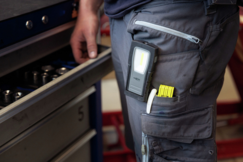 met aan-/uitschakelaar, USB-aansluiting met beschermende rubberafdekking, afgedekte magneten en riemclip voor mobiel gebruik. Brandduur 2,5 - 6 h (bij van/tot gegevens wordt uitgegaan van min. lumen/max. lumen). spot 6 h. reikwijdte 8 - 25 m. straalhoek 120 °. Met de 2-standen functie kan de lichtopbrengst worden ingesteld op hoog - laag. oplaadtijd 2,5 h. display met laadindicator. met werkt op accu en batterijen. Compatibel met lithium-polymeer. temperatuurbestendig van +10 °C tot +25 °C. beschermingsklasse IP65: binnendringen van stof, waterstralen uit alle richtingen.