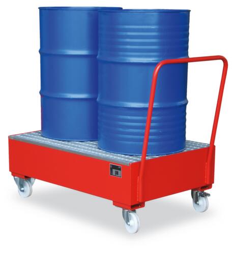 "description": "v. 2x200l vat, opvangvol. 200l, HxBxD 515x1200x800mm, m. rooster, duwbeugel, staal, RAL 5012",