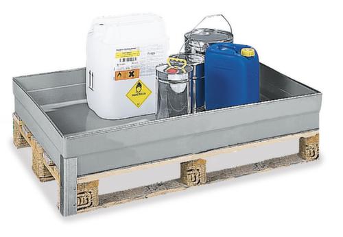 "longDescription": "<h2>Pallet top tray gemaakt van GRP</h2><strong>zeer goed bestand tegen vele oliën en vloeistoffen</strong><br><ul><li>geschikt voor watervervuilende, brandbare en bijtende stoffen</li><li>Bestand tegen minerale en synthetische oliën, rem- en koelvloeistoffen, alkaliën tot pH 8 en de meeste zuren.</li><li><strong>zeer sterk en corrosiebestendig</strong> van glasvezelversterkte kunststof</li></ul><br><h3>Bestel direct:</h3><ul><li>Nog betere houvast - 2 opschroefbare beugels voor extra bevestiging</li></ul><br><h3>De keuze is aan jou:</h3><ul><li>Schuivend of vast - met gladde bodem of met vergrendelingsnokken voor bevestiging tussen de palletborden in de lengterichting</li></ul><br><strong>Bepalingen!</strong><br>Model van de opvangbakken officieel toegelaten. Te gebruiken voor aquatoxische, ontvlambare (vlampunt > 55°C) en agressieve stoffen voor opslag onder dak.<br>",