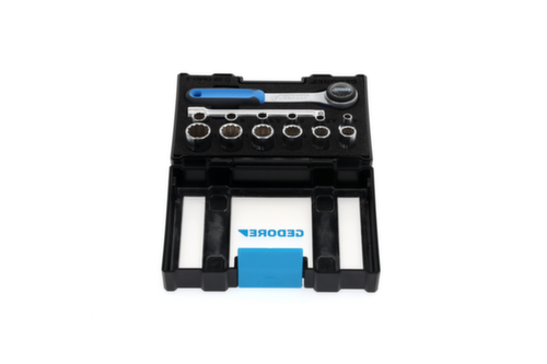 "longDescription": "Met handbediende 12-punts UD profiel doppen en bedieningsgereedschap van vanadium staal 31CrV3, Met extra fijn getande omkeerbare ratel, In kunststof doos, Afmetingen: 160 x 95 x 38 mm<br>",