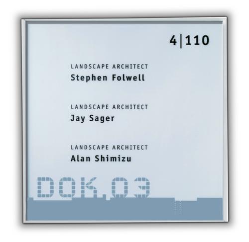 "longDescription": "<h2>Deurbord</h2><strong>voor betere oriëntatie</strong><br><ul><li><strong>zeer flexibel</strong> omdat papieren inlegvellen gemakkelijk te verwisselen zijn</li><li><strong>bescherming tegen stof</strong> - ruit van acrylglas</li><li><strong>tijdloos en robuust</strong> - frame van hoogvaste aluminium profielen</li></ul><br><strong>Goed om te weten!</strong><br>Om het beletteren van de borden nog gemakkelijker te maken, kunt u de ontwerpsoftware en bijpassende inserts direct meebestellen!<br>",