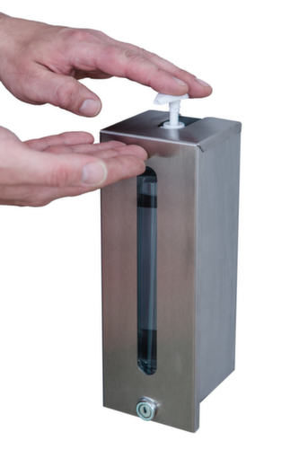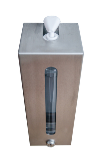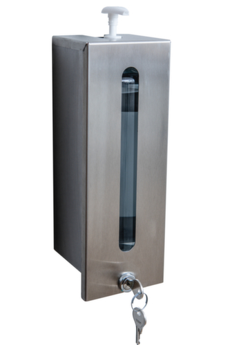 geschikt voor alle (alcoholhoudende) ontsmettingsmiddelen, vloeibare en crèmezepen, lotions en soortgelijke vloeistoffen. met vulpeilindicator, slot. afsluitbaar met veiligheidsslot. van RVS.