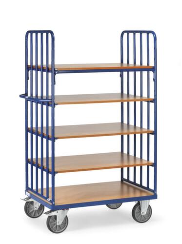 "description": "draagverm. 500kg, 5etage(s), laadvl. LxB 1000x600mm, houtetage, RAL5007, massief rubber-banden",