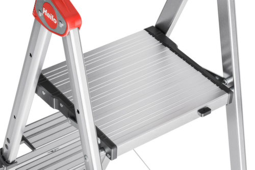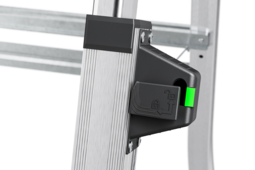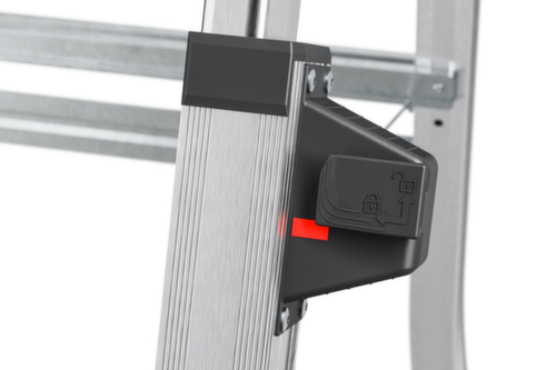 De belangrijkste maten van de Hailo ladder TopLine TL100 in één oogopslag:E4A964FD60462D489E555C101D8D5A25. veilig in gebruik door veiligheids-vergrendelingssysteem van de telescoopelementen met gekleurde "Lock/Unlock"-indicator. uitgerust met bak met uitsparingen van verschillende grootte voor (verf)blikken. bak van kunststof. kunststof antislipvoeten aan het balkeinde. Van aluminium, boom geëloxeerd. Hierdoor worden de handen niet vuil. Bovendien is het geëloxeerde oppervlak gemakkelijk te reinigen. Belastbaar tot 150 kg. 295BE5A64B0A2442A2E4847037EE0AC4. gewicht 8,8 kg.