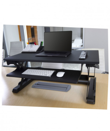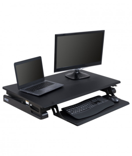 "longDescription": "<h2>In hoogte verstelbare bureaubevestiging</h2><strong>maakt van elke tafel een zit-sta-werkplek tegen een redelijke prijs</strong><br><ul><li>Voor gezonder en productiever werk</li><li><strong>Individueel aan te passen aan de lichaamslengte</strong> - traploze hoogte-instelling</li><li><strong>Ruimtebesparend</strong> - beweegt zich alleen op en neer binnen zijn eigen voetafdruk</li></ul><br><h3>Uitrusting:</h3><ul><li>Opslag voor toetsenbord en muis blijft altijd op zijn plaats tijdens het typen en kan gemakkelijk onder het werkoppervlak worden geschoven wanneer dat nodig is.</li></ul><br><h3>Tafelblad:</h3><ul><li>Biedt ruimte voor twee monitoren</li><li><strong>Beschermt de onderarmen</strong> - met afgeronde hoeken</li><li>van MDF</li></ul><br><h3>Onderstel:</h3><ul><li><strong>Moeiteloos optillen en neerlaten</strong> dankzij het veerondersteunde schaarmechanisme</li><li><strong>Absoluut stabiel</strong> - Stalen frame met rubberen stoppers</li></ul>",