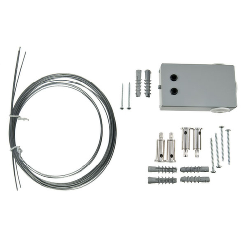 "description": "v. Kubus met vluchtroutepictogrammen, 4xdraadkabel, 8xcilinder, 1xaansluitingsbehuizing, 1xstroomkabel, pluggen, schroeven, plafondmontage, L 3000mm, staal",