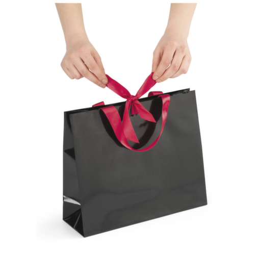 "longDescription": "<h2>Draagtassen van lakpapier met satijnen lint 300 x 100 x 250 mm zwart</h2><p>Naast de elegante uitstraling van het lakpapier heeft deze tas satijnen handvatten en sluitknopen. Het glanzende lakpapier en de satijnen strikken geven de draagtas een elegante uitstraling, waardoor hij bijzonder geschikt is voor feestelijke gelegenheden. - Handvat en sluitknoop van satijn- Versteviging van karton aan de bovenrand- Bodem van karton voor hoge stabiliteit- Met zijvouwen voor gemakkelijk vullen- Gemaakt van 170 g/m² lakpapier- Verpakkingseenheid (PU): 25 stuks</p><br>",