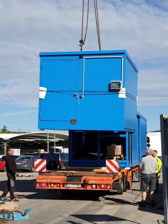 LaCont waterbeschermingscompartiment container, opvangvolume 6 x 550 liter B x D x H 12.200 x 2.910 x 2.800 mm. Comfortabel en functioneel uitgerust met: Ventilatorkachel, LED-verlichting, schakelkast, oprijplaat en een kleine stelling voor kleinemballage.