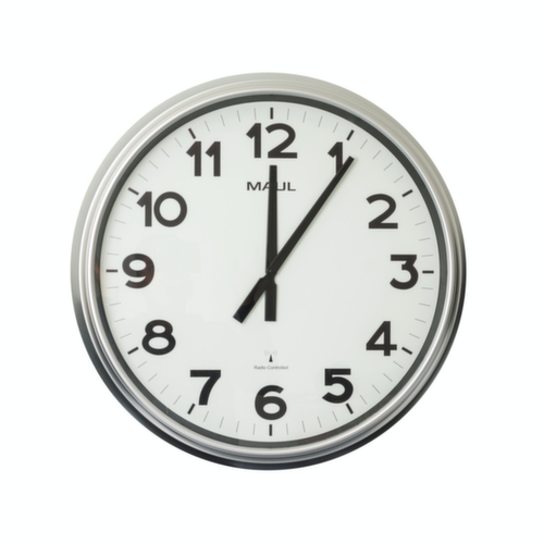 "metaDescription": "MAUL Draadloze wandklok MAULride, met Arabische cijfers en strepen, Ø 610 mm - draadloos signaal, wijzerplaat wit, Arabische cijfers/strepen, weergave analoog, autom. synchronisatie, Ø 610mm, behuizing zilverkleurig, batterij 1x1,5V (AA)",