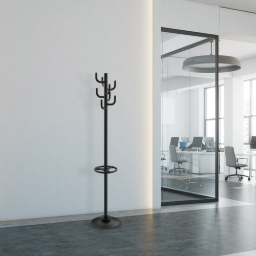 "title": "MAUL Staande kapstok MAULpolaris met parapluhouder, met 8 haken, RAL9004 signaalzwart",