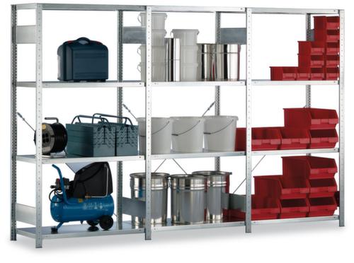 "description": "basis+2xaanbouw, HxBxD 2000x3068x436mm, vakl. 150kg, per veld 4xstalen legbord, hoek recht, eenzijdig, staanders verzinkt, niveaus verzinkt",