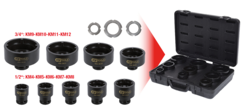 "longDescription": "<ul><li class=\"liste\">Voor het vast- en losdraaien van DIN 981 borgmoeren op assen, span- of trekbussen, enz.</li><li class=\"liste\">Minimaal ruimtebeslag op de moeromtrek</li><li class=\"liste\">Interne tapeinden voor hoge draaimomenten</li><li class=\"liste\">Gebruik van verlengstukken, ratels enz. mogelijk</li><li class=\"liste\">Nauwkeurig aanhalen met koppel</li><li class=\"liste\">Bevestiging op het schroefgereedschap met pin + rubberen ring</li><li class=\"liste\">Werkbereik KM4 tot KM12 (kogellagermoer)</li></ul><br /><strong>Toepassingen:</strong> Monteren en demonteren van rollagers, tandwielen, kegelrollagers, kogellagers, enz. <br /> Landbouwtechniek, bosbouw en gemeentelijke techniek, bouwmachines, industrie, bedrijfswagens enz. <br /><br>",