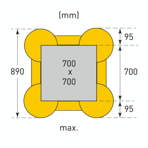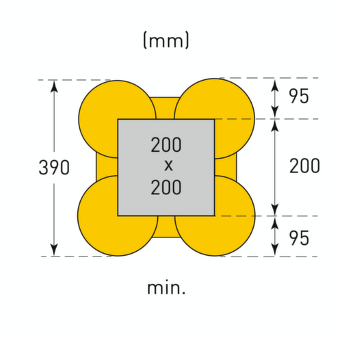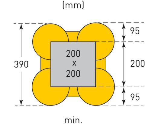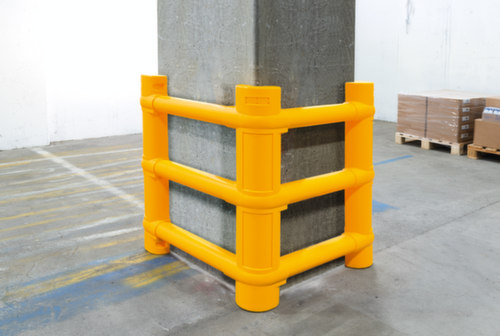 de belangrijkste maten van het Moravia aanrijdbeveiligingssysteem MORION ECO in één oogopslag:De flexibele constructie zorgt er voor dat de afmetingen eenvoudig kunnen worden aangepast aan verschillende zuilafmetingen. Hiervoor worden de dwarsbalken gewoon ter plaatse op de individuele lengte afgesneden. De schaalverdeling met intervallen van 50 mm helpt bij de eenvoudige installatie. van slagvast polyethyleen in geel. Voor het monteren worden de vier zijdelen in elkaar geschoven en vastgezet met schroeven - verankeren in de grond of aan de zuil is niet nodig.