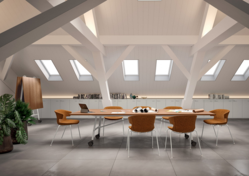"description": "HxBxD 750x3200x1200mm, hoekig, 4voeten wit, ovale buis, blad eiken",