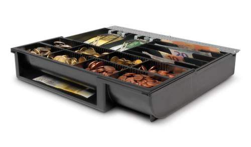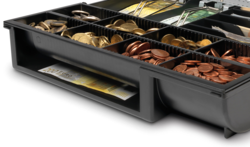 "longDescription": "<h2>Inzetkassalade</h2><ul><li>Apart geldvak als aanvulling op kassalade</li><li>Ideaal voor snelle shiftwissels of het snel vervangen van volledige kassa's </li><li>Robuuste metalen geldclips</li><li>Individuele vormgeving met instelbare vakken voor bankbiljetten en een uitneembaar en instelbaar vak voor 8 verschillende munten</li><li>Met scheidingsgleuf voor het opbergen van grote biljetten en waardepapieren uit het zicht</li></ul><br>1 jaar garantie<br>",
