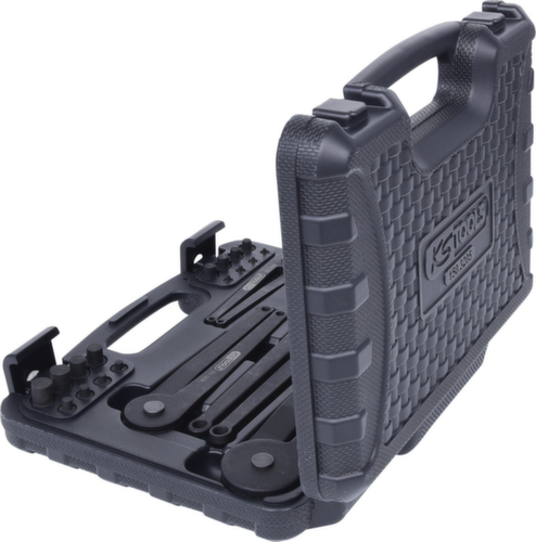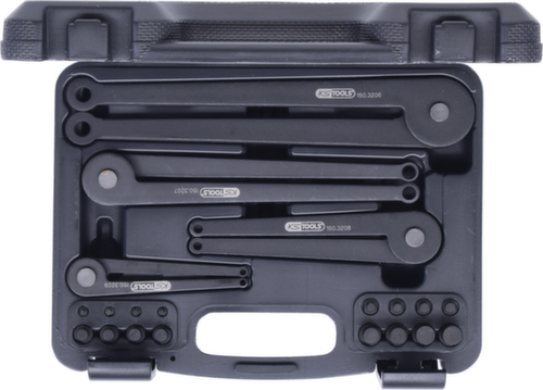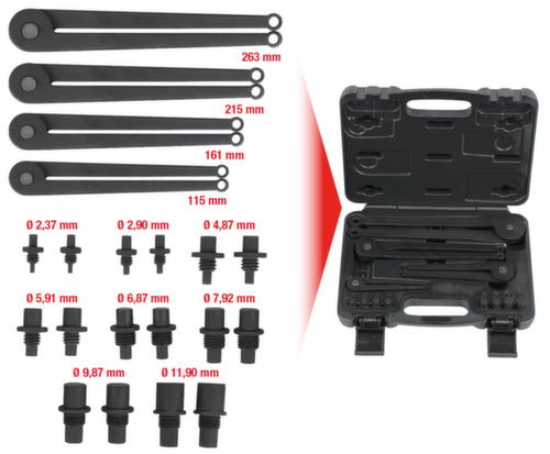 "longDescription": "universeel inzetbaar voor gangbare tweegaats moeren, met verwisselbare paren spiebanen, elke tweegaats moeraanzetter vervangt 4 afzonderlijke sleutelmaten, traploos in diameter verstelbaar, gefosfateerd, speciaal gereedschapsstaal, in stevige kunststof koffer<br>",