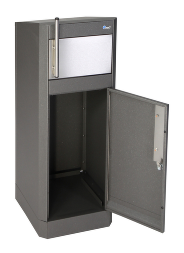 de belangrijkste maten van de stumpf afvalbak Binox Hybrid-25 in één oogopslag:bak niet ontvlambaar volgens DIN 4102, brandveiligheidsklasse A1. Met klep - de opening gebeurt handmatig. De soft-close-functie vermindert niet alleen het geluid, maar beschermt ook het mechanisme van het deksel. deksel met gedempte hygiënische inwerpklep van RVS. binnenbak van staal met corrosiebeschermende zinklaag. uitgerust met verwisselbare kleurstrook voor markering van het afval. Eenvoudig te legen via uitneembare bak. afsluitbaar met driekantslot. romp van Kwaliteitsstaalplaat met corrosiebeschermende zinklaag in ijzerglans. deksel van RVS in zilverkleurig.