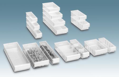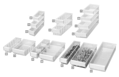 "longDescription": "<h2>Transparante assortimentsdoos</h2><strong>met grote verzonken grepen voor gemakkelijk optillen</strong><br><ul><li><strong>netjes geordend</strong> - met extra groot etiket en etiketbeschermer</li><li><strong>snel overzicht</strong> - bak van transparant polystyreen</li><li><strong>veilig optillen</strong> - ergonomische verzonken grepen aan voor- en achterzijde</li><li>Nauwkeurig stapelbaar dankzij de stapelrand rondom</li><li>Kan op elk moment worden verlengd - gegroefde geleider voor dwarsfrezen</li><li><strong>veelzijdig inzetbaar</strong> - ongevoelig voor de meeste oliën, zuren en logen en bestand tegen temperaturen van -40°C tot +55°C</li></ul><br>De Treston opbergbakken met open voorzijde zijn ideaal voor het opbergen van uw kleine onderdelen. Door de transparantie van het materiaal kunt u altijd zien wat er in de bakken zit. U kunt ze ook labelen met de grote etiketten, zodat uw opbergruimte voor kleine onderdelen individueel en perfect georganiseerd is. Dit bespaart tijd omdat iedereen snel de onderdelen kan vinden die hij nodig heeft. Met de verzonken greep kunt u de bakken voor kleine onderdelen snel en gemakkelijk uittrekken of optillen.<br><br>Polystyreen is absoluut stabiel en heeft zeer goede isolerende eigenschappen. Het is chemisch bestand tegen oplosmiddelen en vloeistoffen op waterbasis. Dit maakt de open opbergkist tot een duurzame, veilige en praktische plaats om uw kleine onderdelen op te bergen.<br><br><strong>Goed om te weten!</strong><br>Praktische dwarsverdelers voor het indelen van de bakken zijn verkrijgbaar als accessoire.<br>",