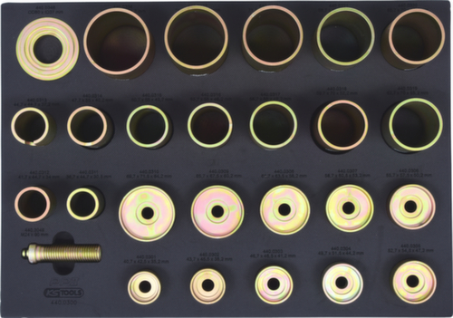"longDescription": "voor montage en demontage van lagers, bussen en steungewrichten, adapter en drukas maken gebruik met universele persstandaard (440.0180) mogelijk, 24 pershulzen met verschillende afmetingen, 61 verschillende binnen- en buitendiameters tussen 30,5 mm en 79,7 mm, universele toepassing voor personen- en bestelauto's, ook uitstekend te gebruiken met werkplaatspers, speciaal gereedschapsstaal<br>",