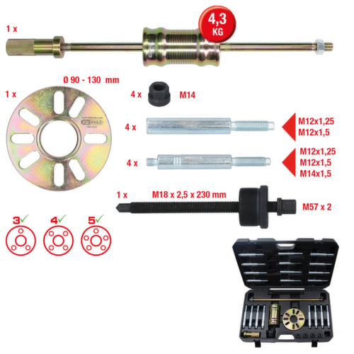 "longDescription": "Uitermate geschikt voor het uitpersen van vastgeroeste of verlijmde aandrijfassen, voor alle personenauto's met 3-, 4- en 5-gaats naven, voor boutcirkeldiameters van 90 tot 130 mm, ideaal voor het demonteren van wielnaven, remtrommels of snelspanassen, met 4,3 kg slaggewicht, geen beschadiging van de aandrijfas of andere onderdelen, eenvoudige en veilige bediening, minimale arbeidsinspanning, speciaal gereedschapsstaal, in robuuste kunststofkoffer<br>",