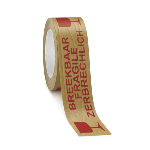 }Versterkte papieren tape met voorbedrukte boodschap - Breekbaar Fragile Zerbrechlich