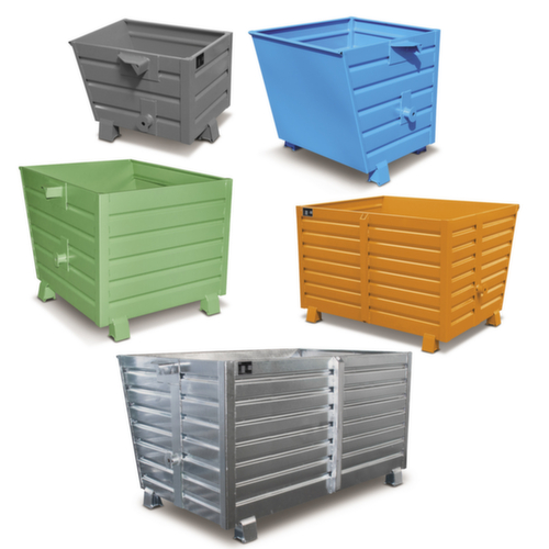 "longDescription": "<h2>Stapelkiepbak type BSKS Stapelkiepbak</h2><h3>type BSK - voor eenvoudigere opslag en transport</h3><ul><br> <li><strong>Robuust</strong>: materiaal gemaakt van geprofileerd plaatstaal</li><br><li>Verkrijgbaar in 6 verschillende maten</li><br><li>Stapelkiepbak type BSK kan 3 hoog worden gestapeld</li><br><li>Thermisch verzinkt of verkrijgbaar in 5 gelakte kleuren</li><br><li>Twee varianten olie- en waterdicht lassen voor stapelkippers: Voor capaciteiten boven en onder 1m³</li><br></ul><p>De BSK stapelkipper is de ideale opslagcontainer voor de opslag en het transport van bulkgoederen, afval of vloeistoffen (in combinatie met apart lassen). De containers zijn beschikbaar voor een breed scala aan toepassingen in 6 verschillende maten en visueel aantrekkelijk in 6 verschillende kleuren.</p><br><p>De containers kunnen moeiteloos worden geleegd dankzij de gladde, afgeschuinde zijkant. Dit kan gemakkelijk worden gedaan vanaf de vorkheftruckstoel met behulp van een touwlift naast de dwarsbalk voor stapelkippers. De stapelkippers kunnen ook zonder deksel tot drie hoog worden gestapeld, zowel leeg als vol.</p><br><p>Om vloeistoffen lekvrij op te slaan en te transporteren in de BSK stapelkippers is de olie- en waterdichte las de ideale aanvulling. De afdichting is verkrijgbaar voor de modellen STBSK30*, STBSK55*, STBSK70* en STBSK90* met een inhoud van <1m³ (bestelnr. -) en voor STBSK150* en STBSK200* voor volumes van meer dan 1m³ (bestelnr. 287081).</p ><br><p>Let op: Het optionele laswerk is alleen direct beschikbaar bij aankoop van de stapelkipper en kan niet achteraf worden gemonteerd.</p><br><br><p><strong>Meer informatie</strong></p> <br><ul><br><li>Verkrijgbare accessoires: wielen (287702), verzinkt deksel (LST*), lassen (WOW*), dwarsbalk (TST*)</li><br><li>Materiaal: geprofileerd plaatstaal</li><br><li>Beschikbare versies: thermisch verzinkt of gelakt in vuurrood (RAL 3000), geeloranje (RAL 2000), lichtblauw (RAL 5012), resadagroen (RAL 6011), muisgrijs (RAL 7005)</li><br><li>Twee versies van de optionele olie- en waterdichte lassen voor stapelkippers: Voor capaciteiten boven en onder 1m³</li><br><li>Let op voor olie- en waterdicht lassen: te bestellen bij aankoop van de stapelkipper, geen extra aankoop mogelijk op een later tijdstip</li><br></ul><br>",