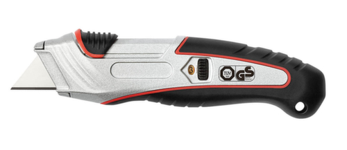 "longDescription": "<h2>Safety cutters</h2><strong>met automatisch inschuifbaar lemmet</strong><br><ul><li>geschikt voor rechts- en linkshandige gebruikers</li><li>ergonomisch gevormde metalen handgreep met rubberen greepzone</li><li>lemmet met veerbekrachtiging en automatisch inschuifbaar lemmet, zodra het niet meer in contact komt met te snijden materiaal</li><li>met instelwieltje, snijdiepte in 3 treden instelbaar: 9 mm, 15 mm en 25 mm</li><li>eenvoudige vervanging van lemmet met borgrand</li><li>met ophangopening</li></ul><br><h3>Inhoud levering:</h3><ul><li>incl. 5 trapeziumvormige reservelemmeten van SK5-carbonstaal</li></ul><br><h3>Keurmerk / Getest conform:</h3><ul><li>GS-teken - TÜV-getest</li></ul>",