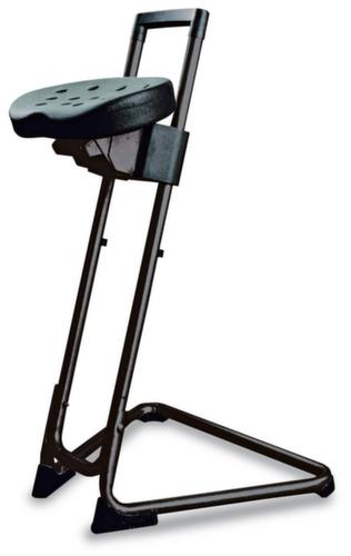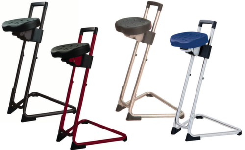 "longDescription": "<h2>Staande hulp</h2><strong>draaibare stoel met automatische terugloop</strong><br><ul><li><strong>ondersteunt een ergonomische houding</strong> zitting kantel- en zwenkbaar</li><li><strong>aan te passen aan de lichaamslengte</strong> door 8 vergrendelposities</li><li>Bijzonder robuuste zitting van PU-schuim met stalen inleg</li><li>Slag- en krasbestendig oppervlak - Frame met poedercoating</li><li>Veilige stand dankzij antislip vloerglijders</li></ul><br>De stahulp voor ontspannen staan waar zitten niet mogelijk is. De zeer stabiele stahulp is geschikt voor personen tot 120 kg, draagt het GS-keurmerk en heeft 5 jaar garantie. De staande stoel ontlast de benen, rugspieren en wervelkolom. Dit komt niet alleen de gezondheid, maar ook de prestaties en productiviteit van uw werknemers ten goede.<br><br>De zithoogte is traploos instelbaar. De zitneiging kan tot 15° worden versteld. Met de extra 16° horizontaal draaibare zitting kan de stahulp optimaal aan de gebruiker en zijn werkgebied worden aangepast. De ergonomisch gevormde comfortzitting van integraalschuim is slijtvast en eenvoudig te reinigen. Het roestvrijstalen frame is bijzonder geschikt voor vochtige ruimtes en werkomgevingen met hoge hygiënenormen. Antislip vloerglijders zorgen voor een veilige stand.<br>",
